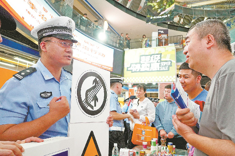 7月6日晚,乌鲁木齐市公安局交警支队高新区(新市区)大队民警在星品汇购物中心向市民讲解各种交通标识的含义。当日,乌鲁木齐市公安局在全市范围内开展夏夜治安巡查宣防第一次集中统一行动,以实际行动为群众“守夜”、为平安“站岗”。