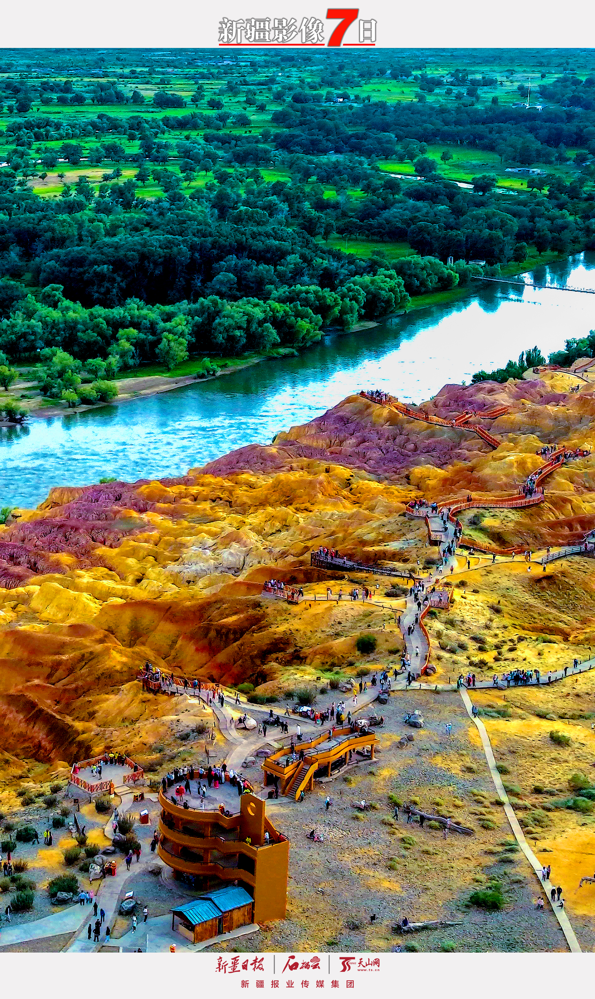 7月2日,游客在布尔津县五彩滩景区游玩,欣赏雅丹地貌(无人机摄)。进入7月,该景区游客接待量持续增加,各地游客纷至沓来,感受这里一河两重天的奇特景观。王志清 摄