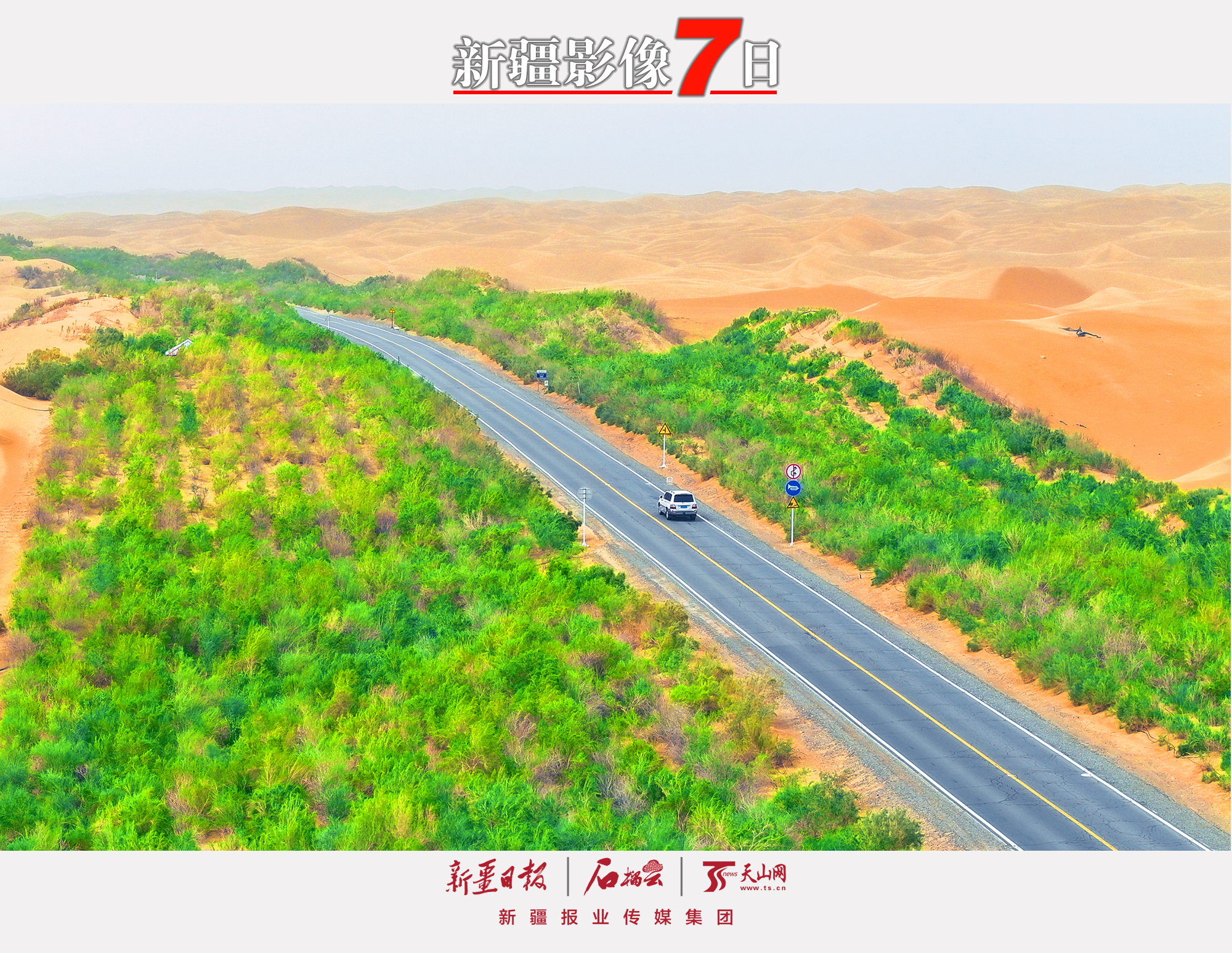 7月4日,雨后的塔里木沙漠公路两侧绿意盎然,成为沙海中一道壮美景观。近年来,塔里木油田通过在沙漠公路沿线建设光伏电站替代柴油机发电,打造出我国首条零碳沙漠公路。汪涛 摄