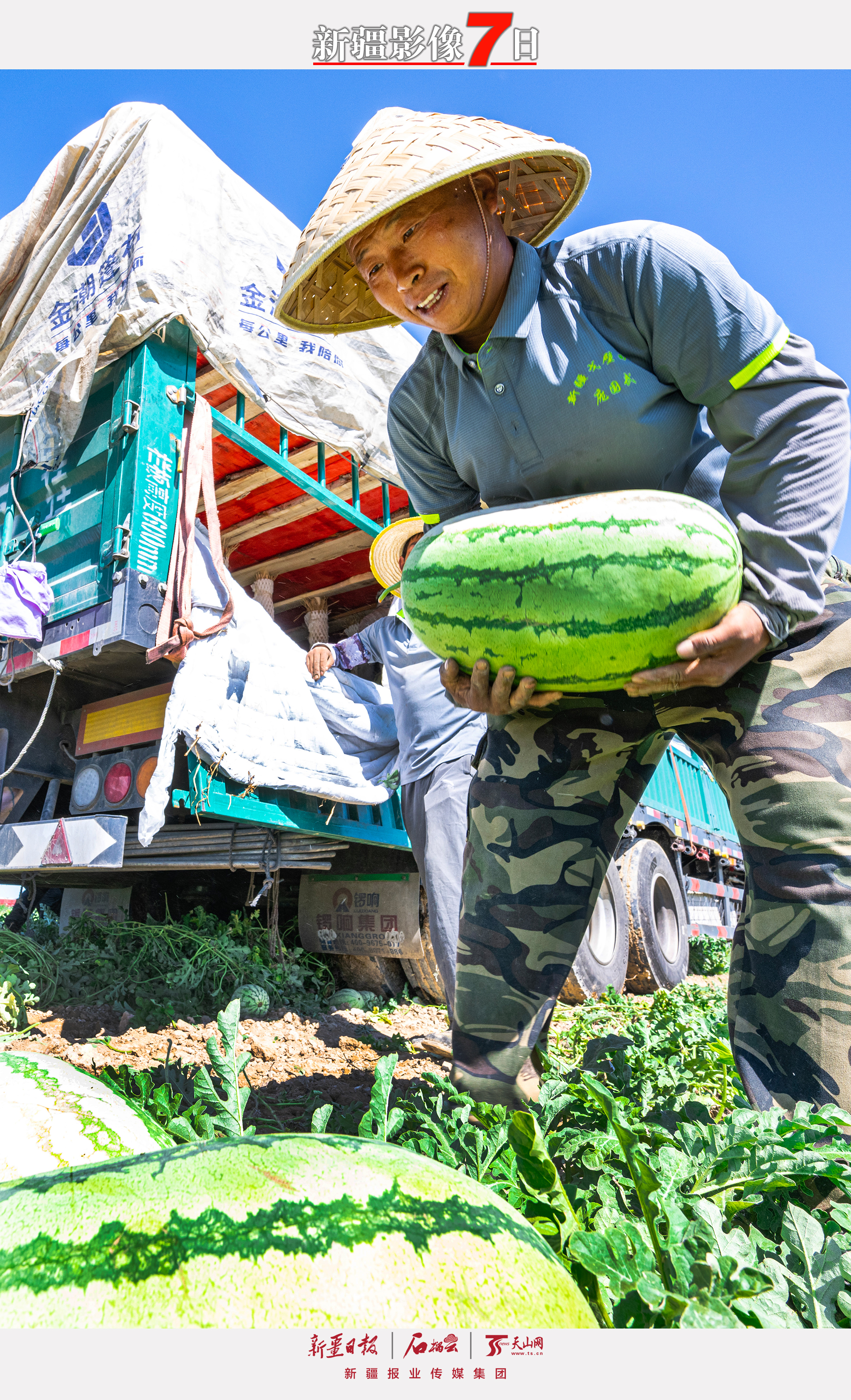 7月4日,瓜农在昌吉国家农业高新技术产业示范区现代农业示范园装运西瓜。进入7月,昌吉回族自治州2.7万亩西瓜陆续成熟,来自全国各地的水果商把车开到地头收购外运。何龙 摄