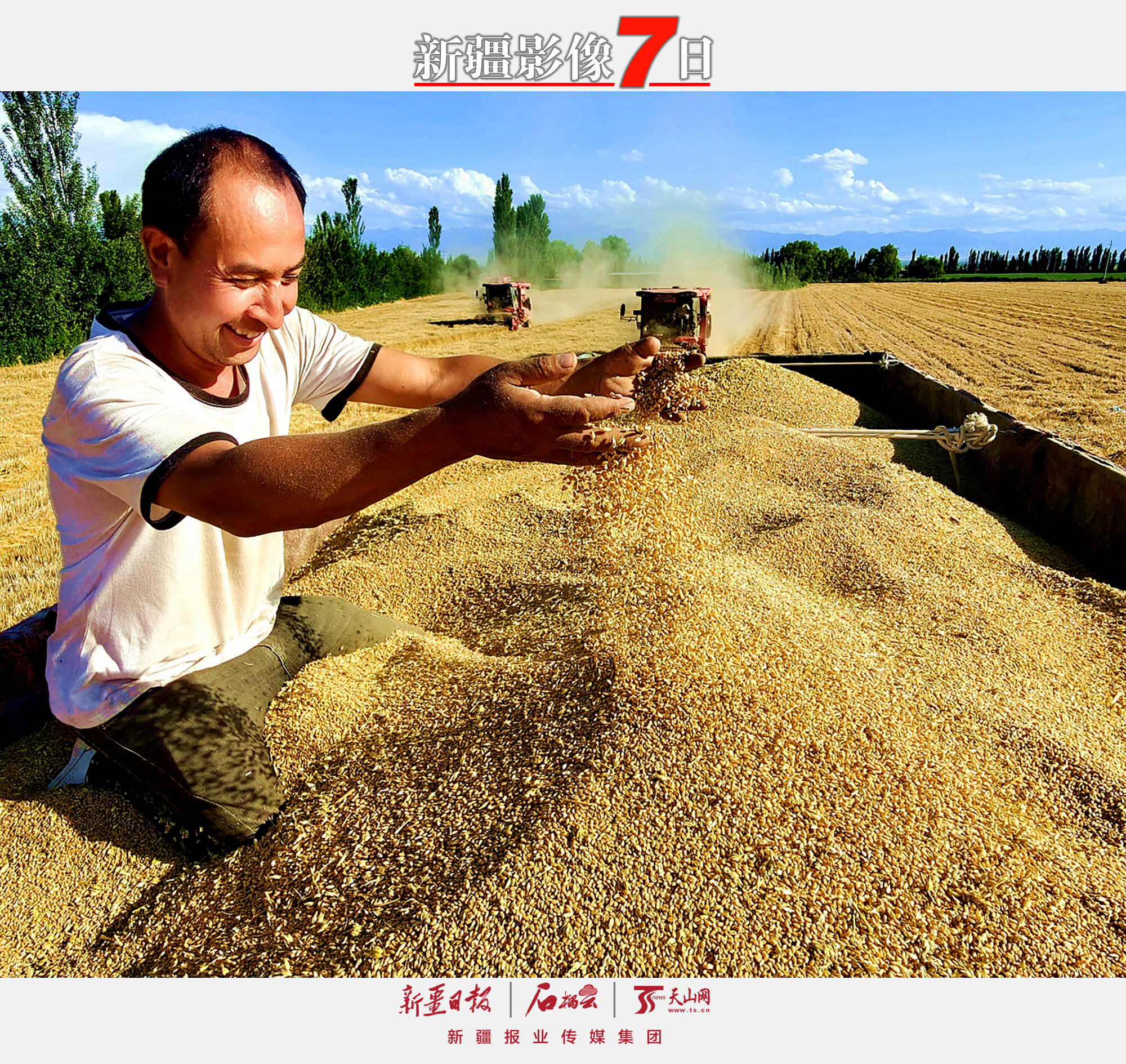 田野间,农民手捧麦粒、怀抱西瓜,喜悦甜过瓜果。