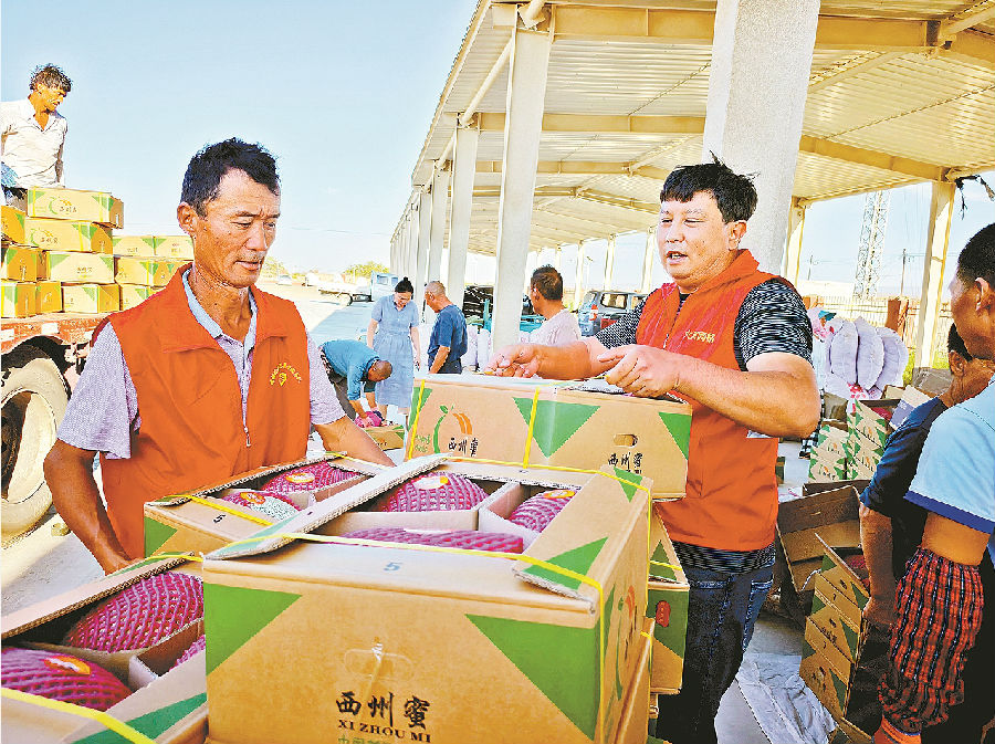 6月25日,托克逊县夏镇喀格恰克村网格中心网格员帮助瓜农销售哈密瓜。
