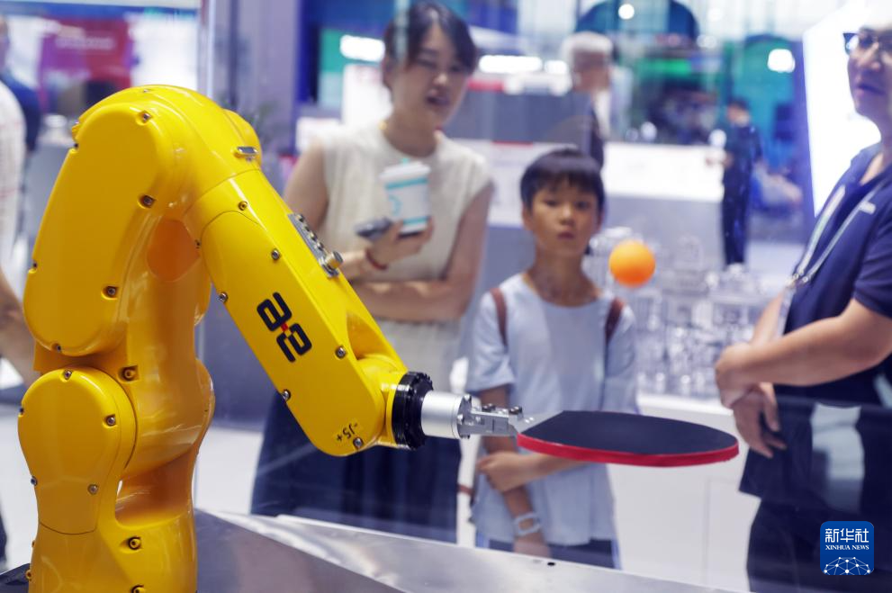 7月14日,观众在科博会上观看一款运动机器人。新华社记者 潘旭 摄