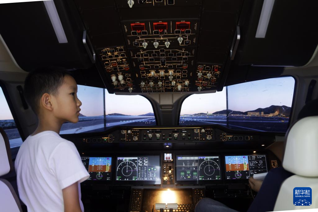 7月14日,一名小观众在科博会上参观展出的C919大飞机模拟舱。新华社记者 潘旭 摄