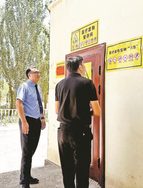 针对部分乡镇卫生院存在医疗废物管理不规范的情况,轮台县检察院向相关行政机关制发检察建议书,督促其规范管理医疗废物。图为检察官检查医疗废物存放点。 麦尔旦 摄