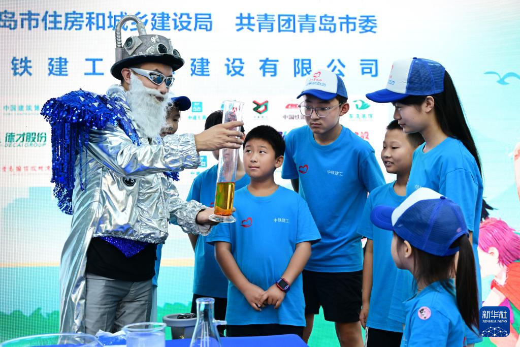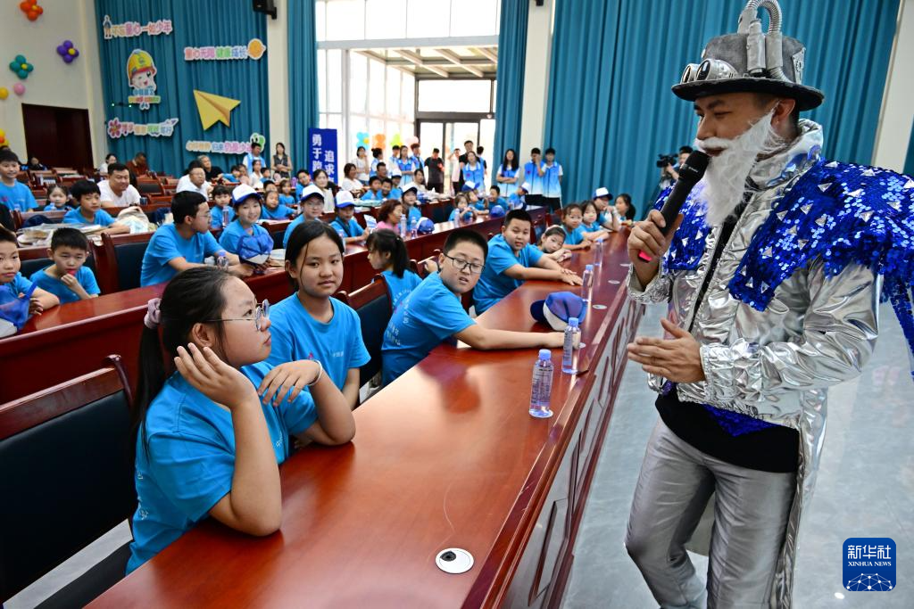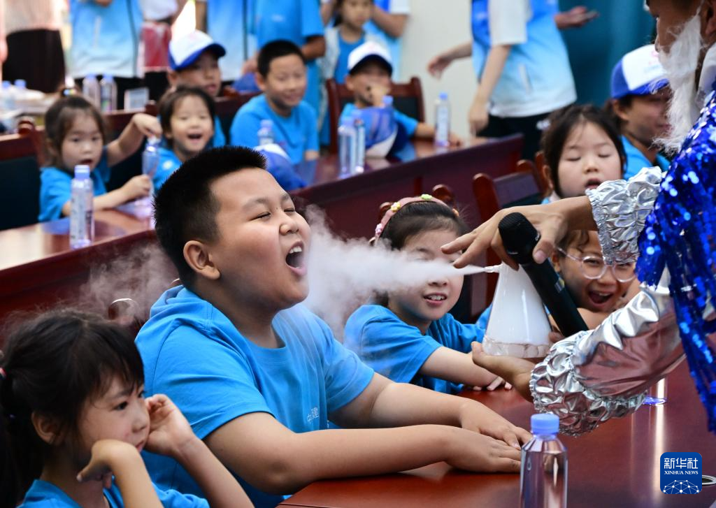 7月25日,“科学博士”在给孩子们讲解科学小实验。新华社记者 李紫恒 摄