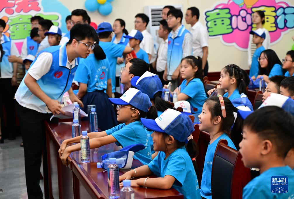 7月25日,孩子们在活动启动仪式上领到了开班大礼包。新华社记者 李紫恒 摄