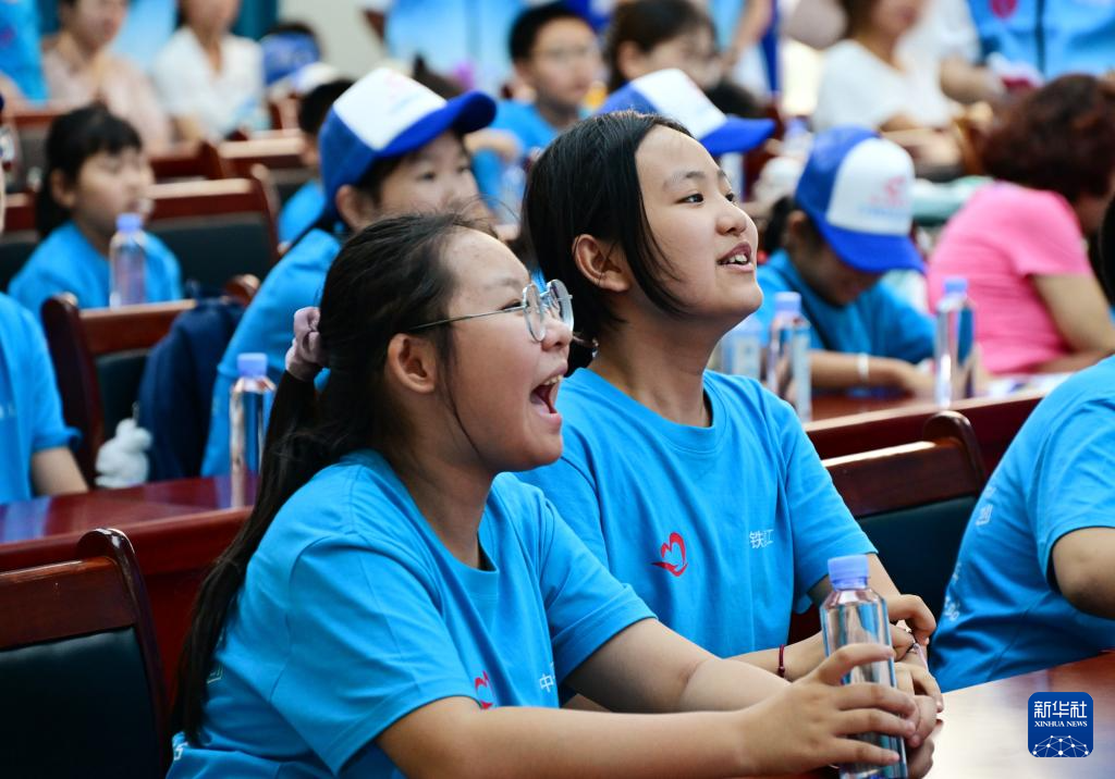 7月25日,孩子们在活动启动仪式上分享领到的开班大礼包。新华社记者 李紫恒 摄