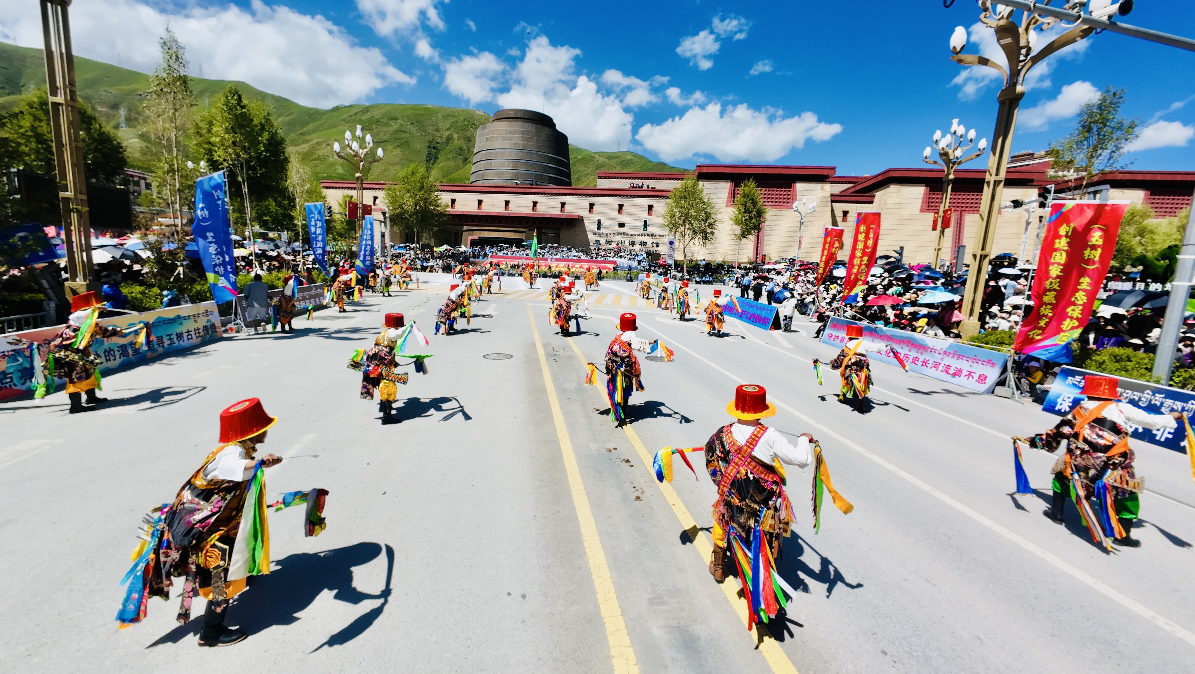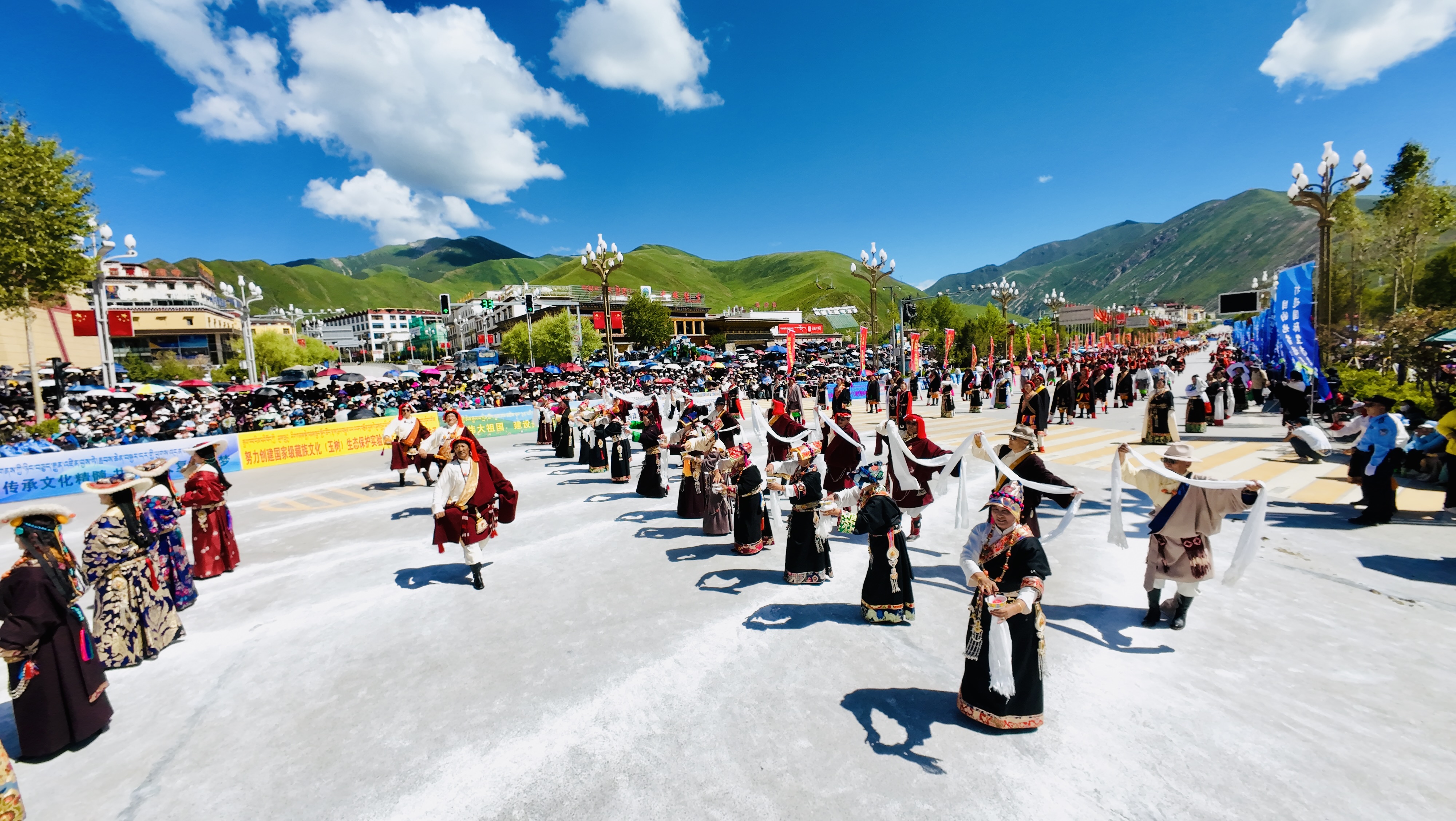 湛蓝的天空映衬着高原的江河,洁白的雪山滋养无垠的牧场,又是一年高山流水萦绕着牧歌的时节。7月24日,一场行走的非遗展在青海省玉树藏族自治州玉树市街头上演。“潇洒的康巴人”——国家级藏族文化(玉树)生态保护实验区建设成果非遗巡演现场,潇洒多彩的玉树民族民俗文化在此呈现。