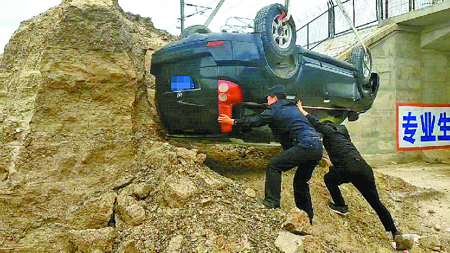 为了尽量减少小杨身体摆动的幅度,经商议,大家决定采用在斜坡上放置车辆,吊车绳索牵引,人力辅助减少震动的方法翻转车辆。