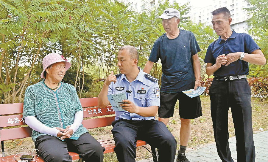 7月27日,乌鲁木齐市公安局沙依巴克区分局骑马山派出所副所长王启虎向居民宣传反诈知识。