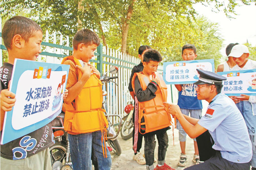 7月30日,新疆出入境边防检查总站克州边境管理支队恰提铁列克边境派出所民警在辖区开展暑期防溺水安全教育活动。