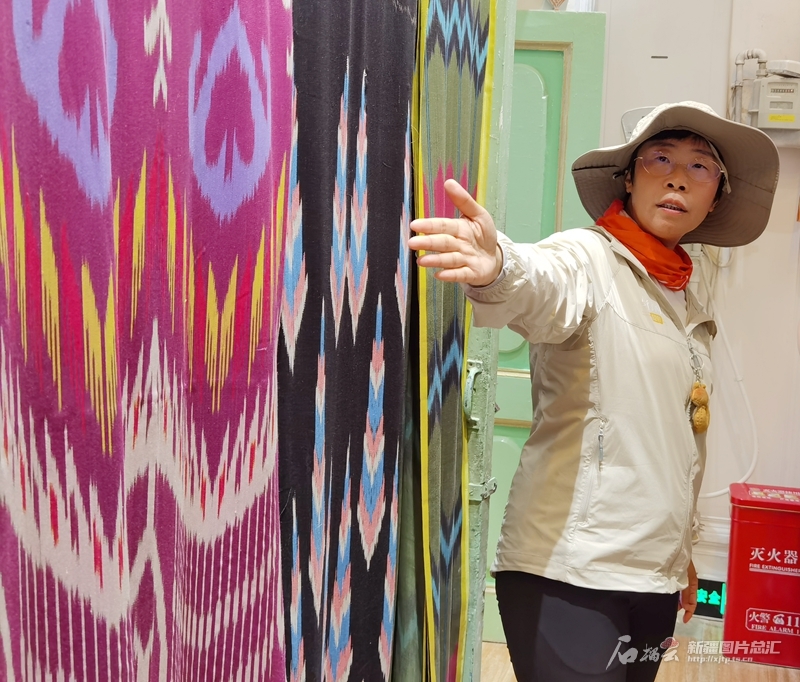 蒙曼在喀什古城艾德莱斯非遗馆参观。