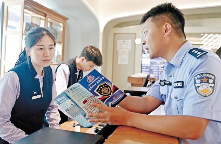 民警来到辖区酒店、旅馆,围绕公安部对酒店、旅馆经营者接待未成年人入住提出“五必须”要求开展宣传,防范在酒店、旅馆中发生侵害未成年人的案件。石榴云/新疆法治报记者 单坤 摄