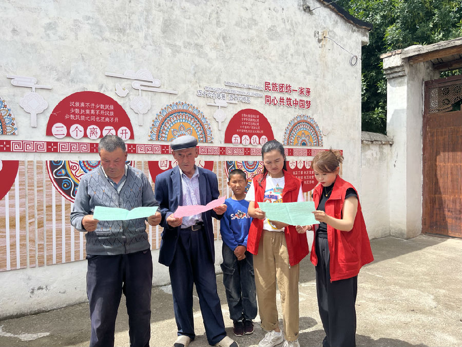 司法所工作人员和普法志愿者向邻居们发放普法宣传单。通讯员 吐尔洪·都拉提汗摄
