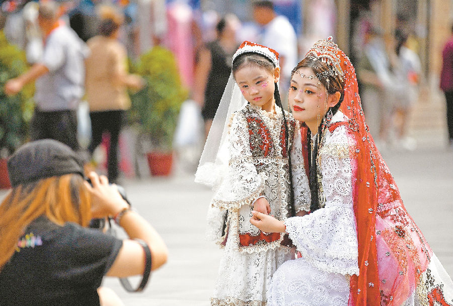 8月13日,游客在新疆国际大巴扎步行街拍照。