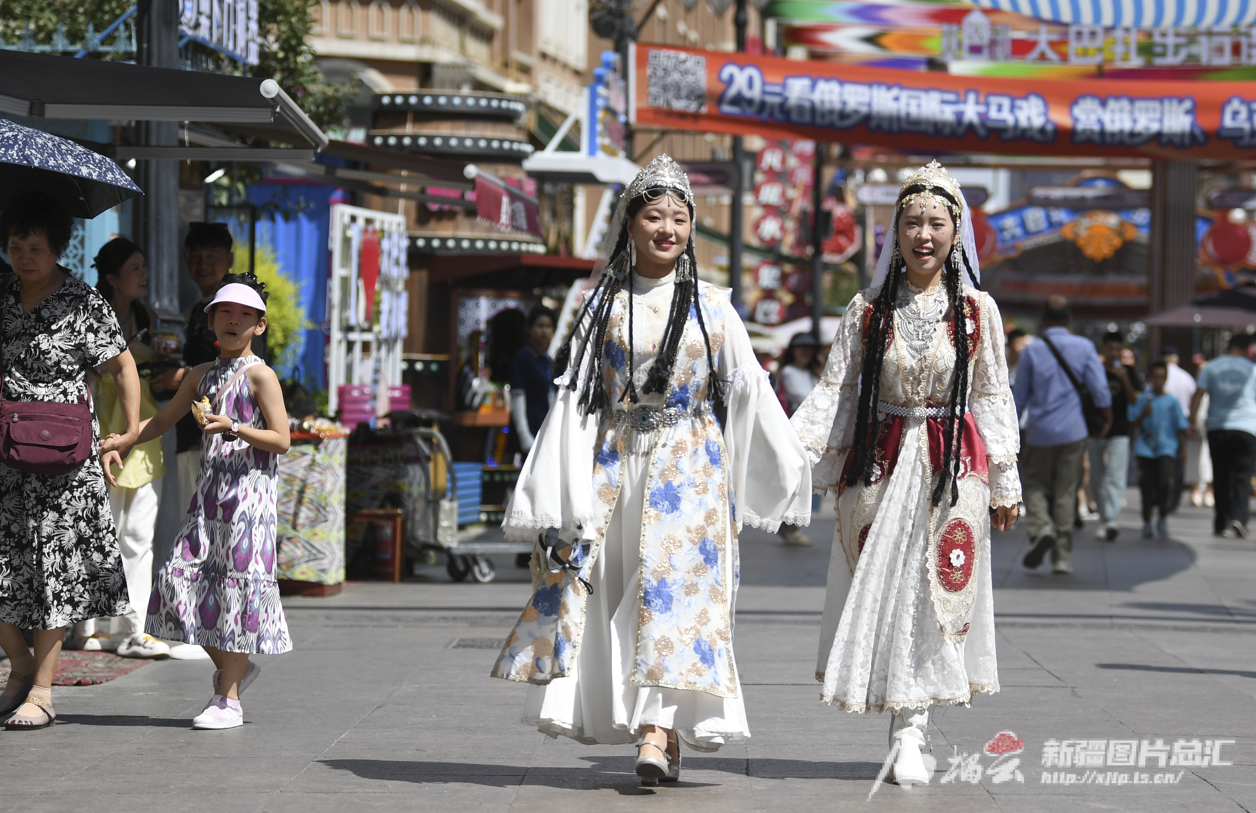 天山网-新疆日报讯(记者汤永摄影报道)8月正值新疆旅游旺季,乌鲁木齐大巴扎步行街独具民族风情的旅拍项目越来越受到游客的喜爱,成为备受推崇的热门体验项目,步行街上随处可见游客穿着特色服装,沉浸式体验当地风土人情。