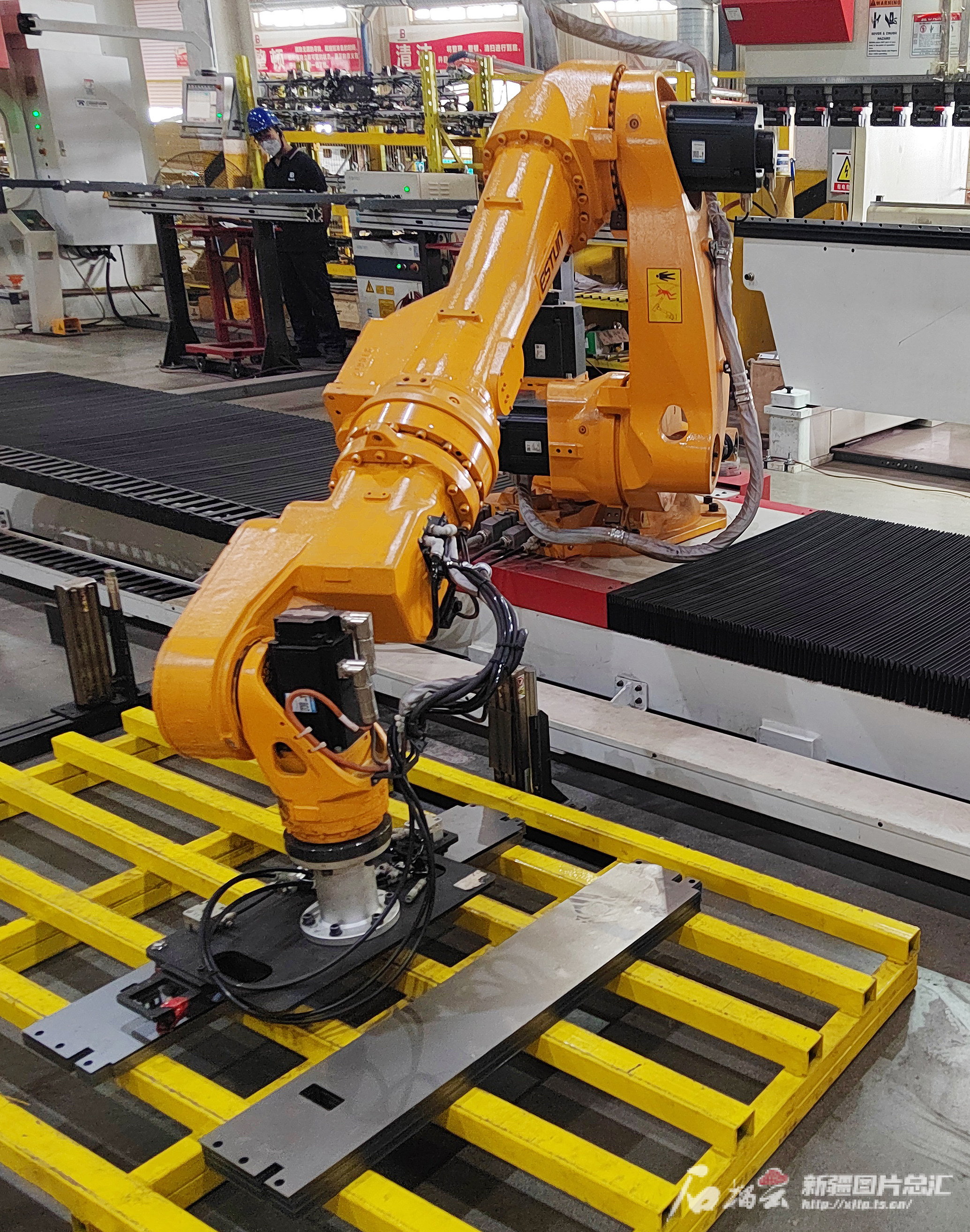 8月13日,智能机器人在新疆钵施然智能农机股份有限公司生产车间参与采棉机零部件生产。