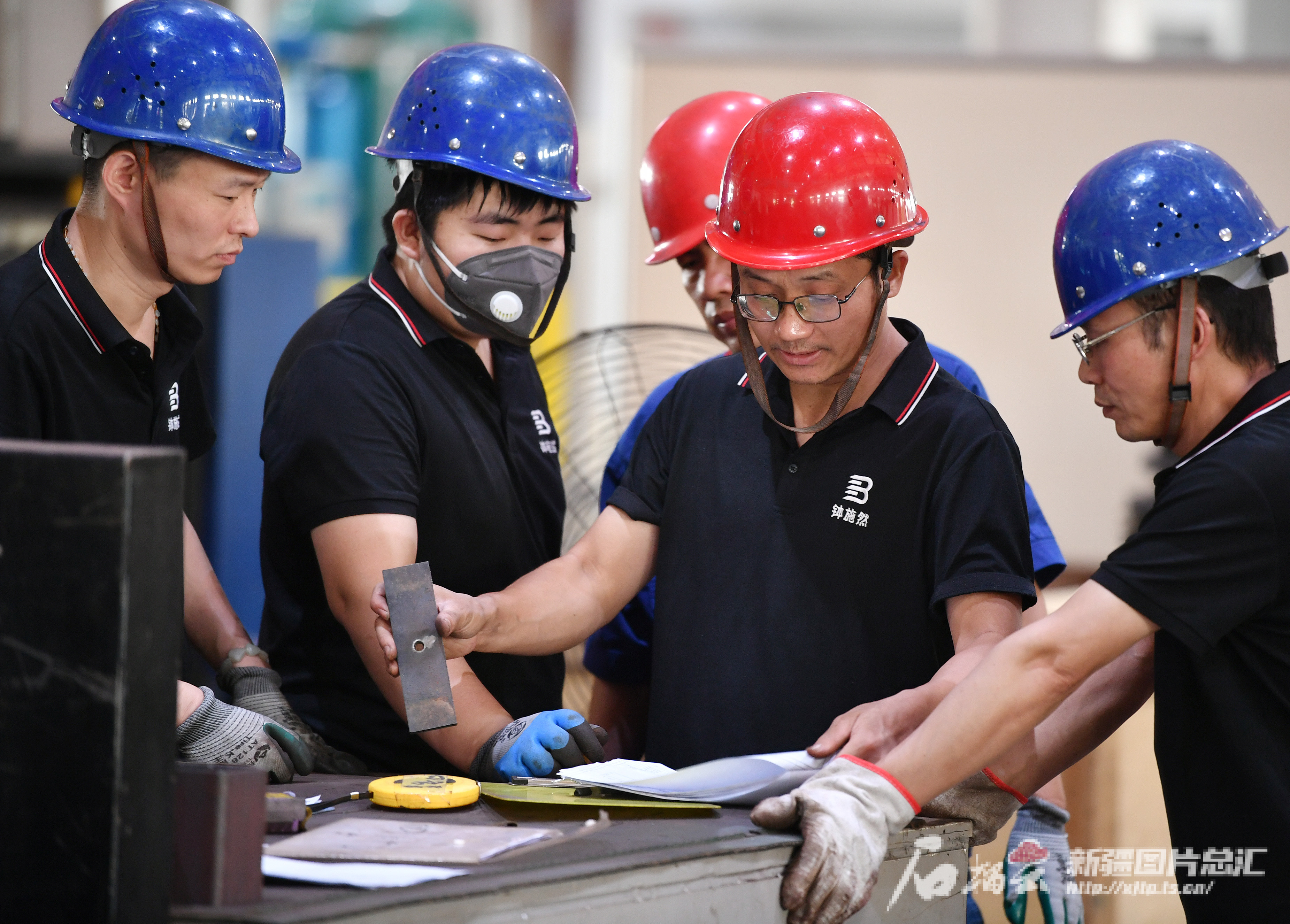 8月13日,工作人员在新疆钵施然智能农机股份有限公司生产车间讨论生产方案。