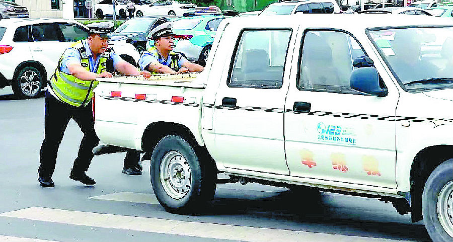 8月26日,昌吉市民王先生送儿子上学时遭遇车辆抛锚,该市公安局交警大队民警发现后,赶紧推行抛锚车辆离开,避免造成交通拥堵。