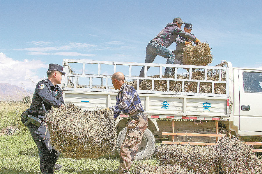 近日,新疆出入境边防检查总站克州边境管理支队阿合奇边境管理大队哈拉奇边境派出所成立“助农小分队”,在田间地头帮助牧民搬运牧草(如图)。