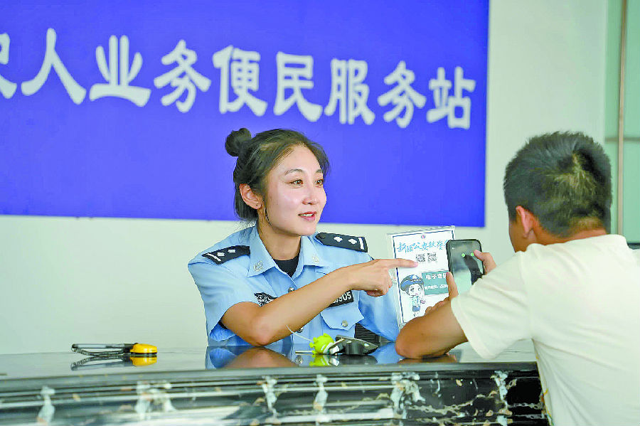9月9日,霍尔果斯市公安局交警大队便民服务站民警指导群众在线办理车驾管业务。