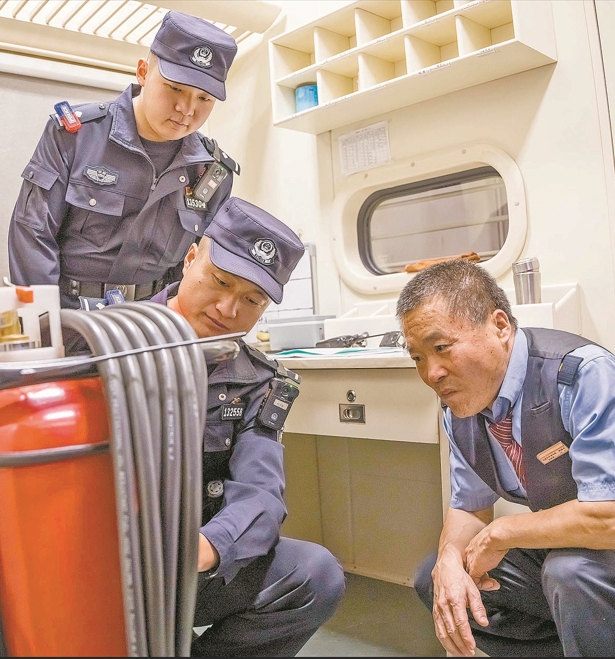 9月23日,李连杰(中)和民警赵天璞(左)与乘务员对行李车内的消防设施进行安全检查。 李国贤 摄
