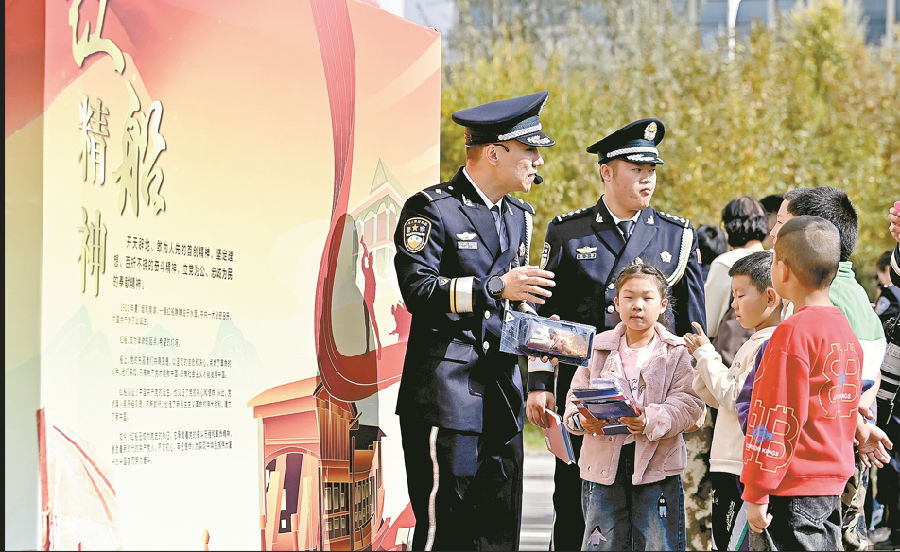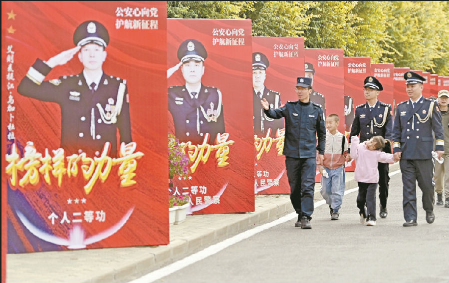 参加活动的民警带孩子走过英模海报长廊,介绍英模故事。