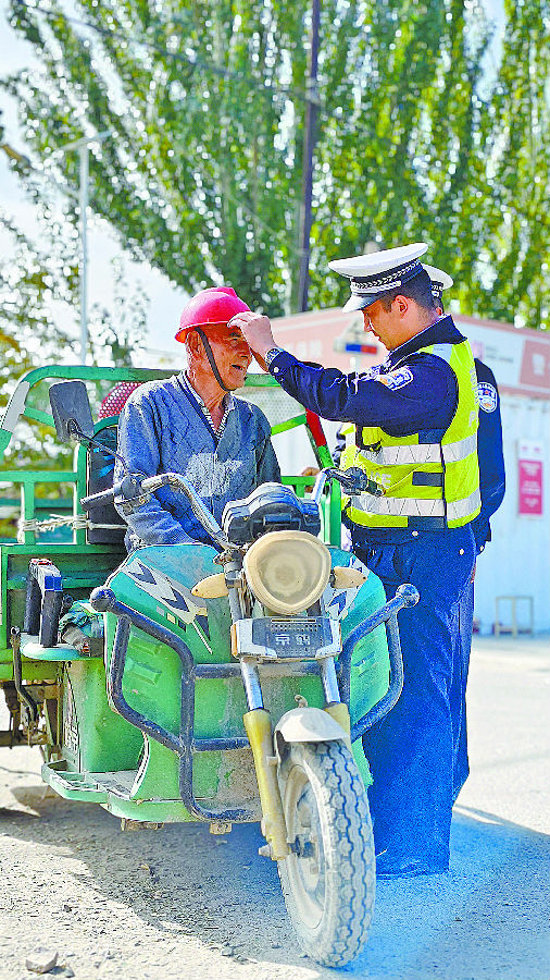 10月17日,阿克苏市公安局交警大队民警为电动三轮车驾驶人规范佩戴安全头盔。