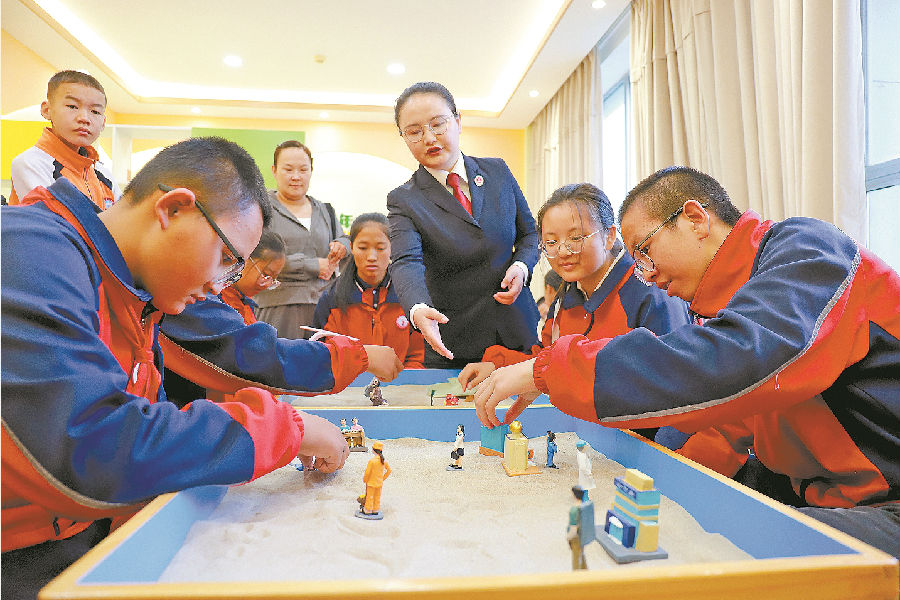 10月16日,由300余名中小学生组成的青少年普法研学班走进巴音郭楞蒙古自治州人民检察院未成年人法治教育基地,在互动式、体验式学习中感受法治力量。图为学生们在心理疏导室体验沙盘游戏。