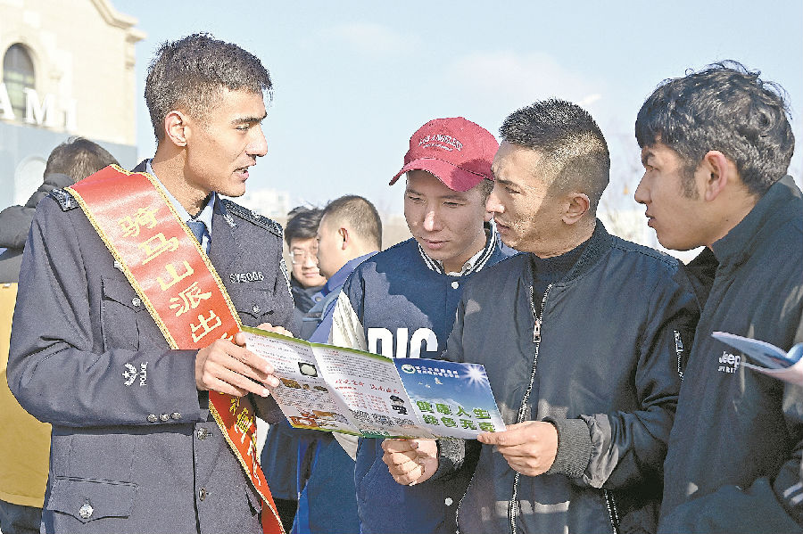 10月21日,乌鲁木齐市公安局沙依巴克区分局骑马山派出所民警向群众讲解毒品危害。