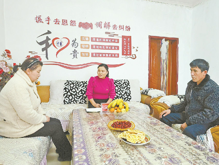 今年2月,温宿县托乎拉乡河畔村“法律明白人”哈丽旦木·托乎逊(中)化解矛盾纠纷。