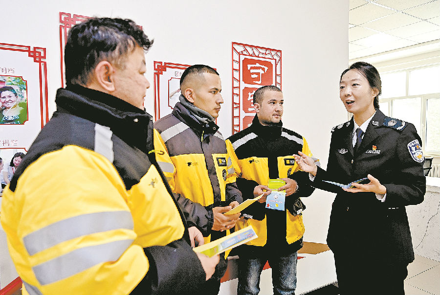 10月22日,乌鲁木齐市沙依巴克区司法局平顶山司法所干警姜芳(右)向外卖小哥宣讲法律知识。