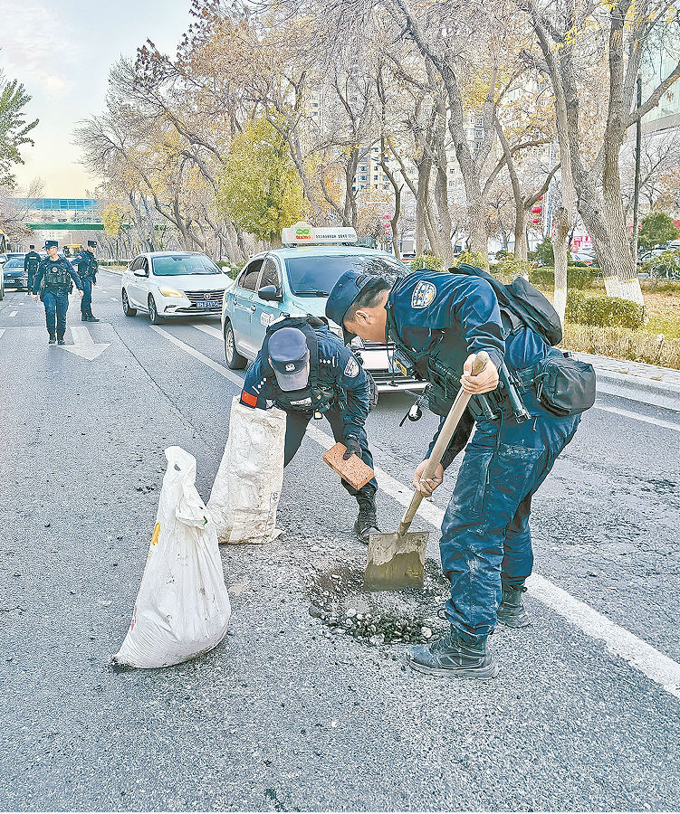 10月19日18时许,乌鲁木齐市公安局特警七支队五大队民警巡逻至北京中路,发现路面有三处坑洞,易引发车辆刮擦、爆胎。民警向有管辖权的路政部门说明情况后,采取临时措施,一边疏导交通,一边填坑补路。经过民警努力,道路修补好了,过往驾驶人纷纷为民警的暖心之举点赞。