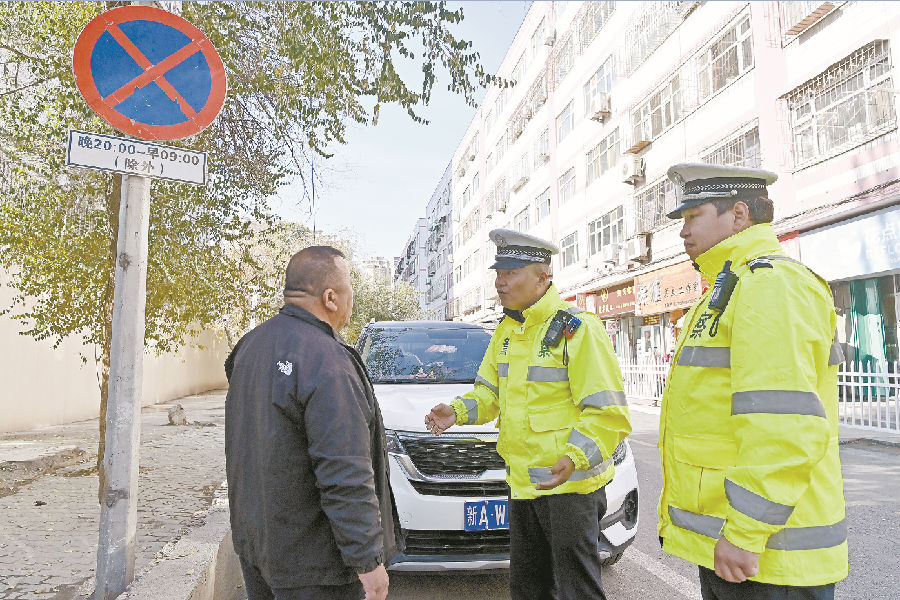10月28日,乌鲁木齐市公安局交警支队沙依巴克区大队西北路中队民警批评教育不按时段停车的驾驶人。
