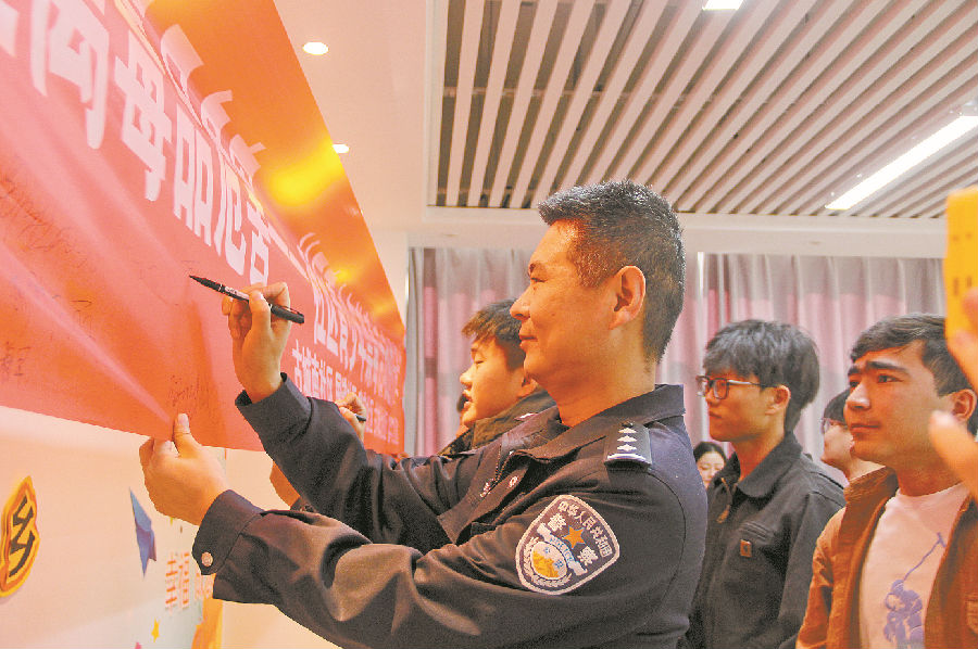 图为民警与学生在宣传横幅签名表明拒毒决心。 阿尔祖古丽·吾普尔 摄