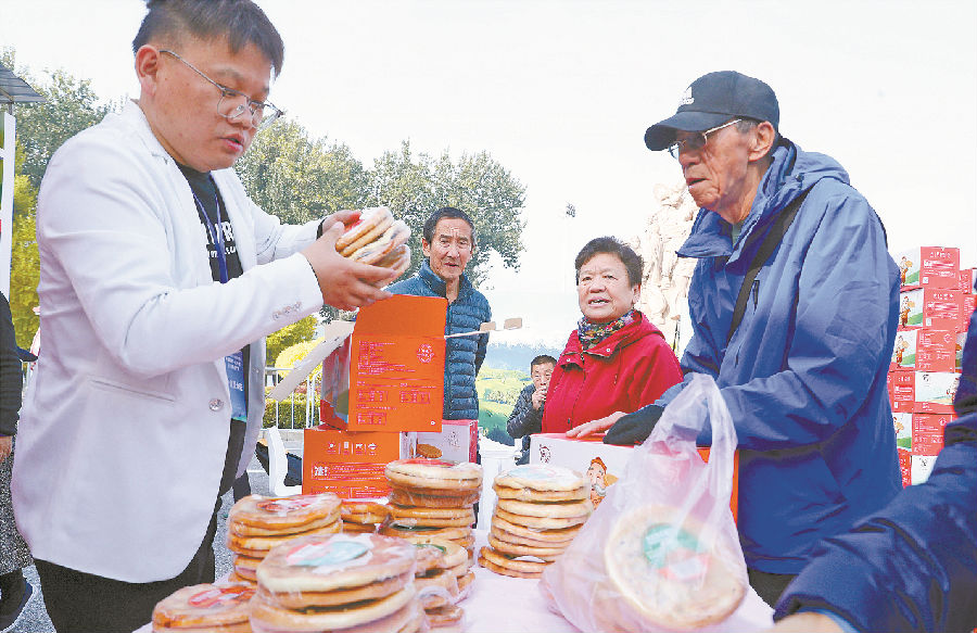 10月30日,北京市民在新疆农产品北京交易会和田美食展区选购馕产品。