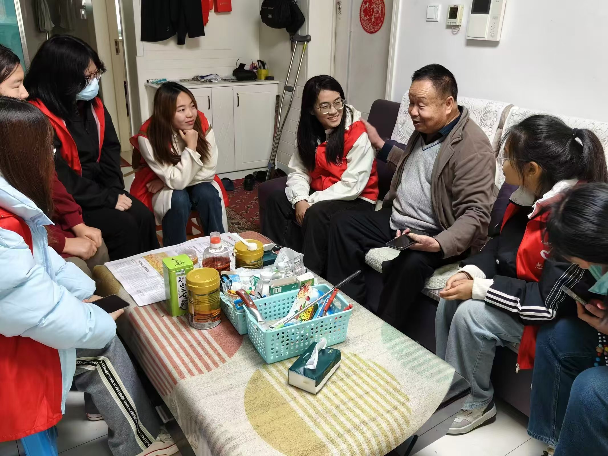 财经大学志愿者们来到高龄老人刘一廷老人家中,与老人亲切交谈,详细了解老人的身体和生活状况,贴心询问老人在日常生活中有哪些实际困难,倾听老人讲述他年轻时在牧场的故事,“这几年身体条件不错,平时一个人居住很少做饭吃,中午就到华润万家负一楼“金色晚霞”助餐点就餐,有适合老年人的餐食,没事就出去旅旅游,国内基本都转遍了,现在就是想着趁身体还可以到国外转转。你们一定要好好学习,将来凭自己的努力过上自己想要的生活。”刘一廷老人说道。