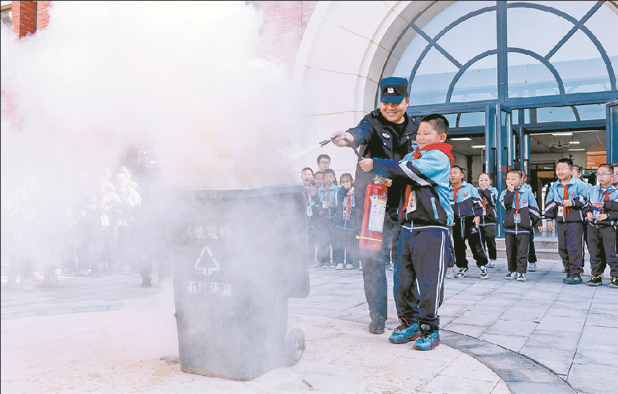 图为民警教学生使用灭火器灭火。 石榴云/新疆法治报记者 单坤 摄