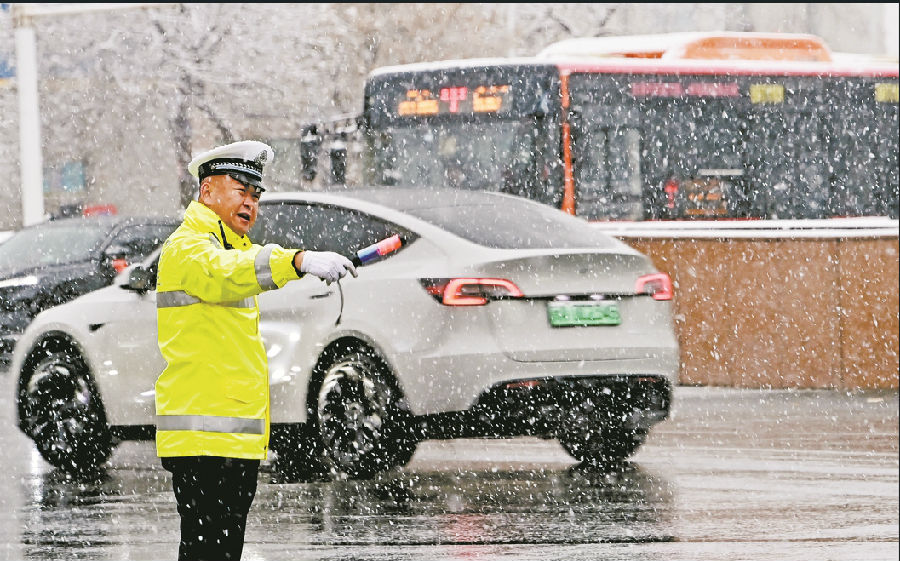 11月14日,乌鲁木齐市公安局交警支队沙依巴克区大队友好路中队民警在雪中指挥交通。石榴云/新疆法治报记者 单坤 摄