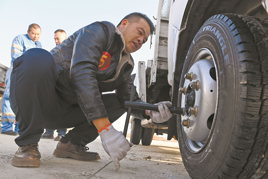 此次竞赛着重考查货车驾驶人综合技能水平,来自全市18家企业的52名道路货运汽车驾驶人同台竞技,展现风采。图为选手参加排除故障更换轮胎竞赛。 石榴云/新疆法治报记者 单坤 摄