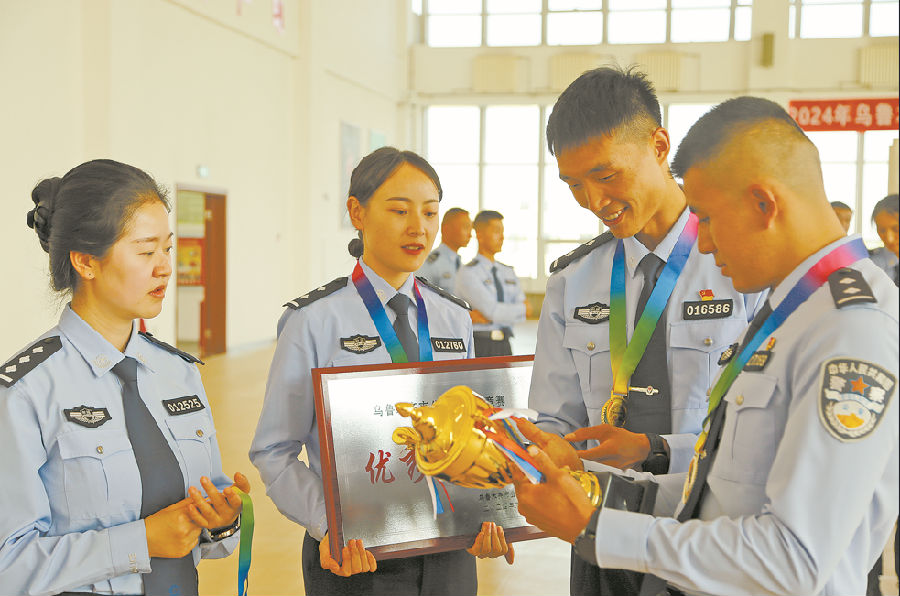 在乌市公安局全警实战大练兵2024年警体竞赛闭幕式上,曾旭旭与焦帅手握奖杯,相互勉励。