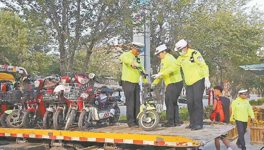 7月22日,福海县公安局交警大队民警集中回收查处的电动自行车。 温剑萍 摄