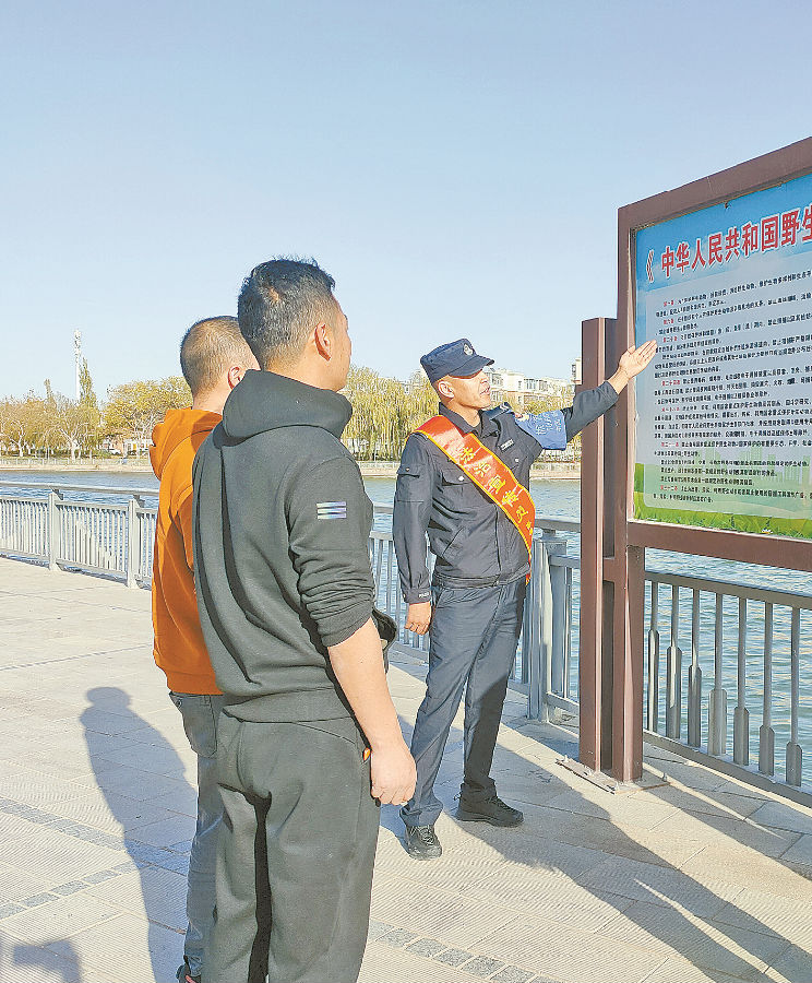 11月22日,库尔勒市公安局民警向游客普及野生动物保护相关法律法规。 赵永伟 摄