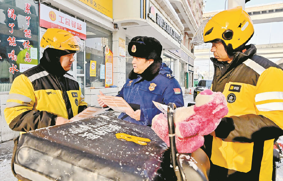 A+ | a12月11日,乌鲁木齐消防救援支队新市区大队消防监督员迪里木拉提·地里夏提给外卖骑手讲消防知识。