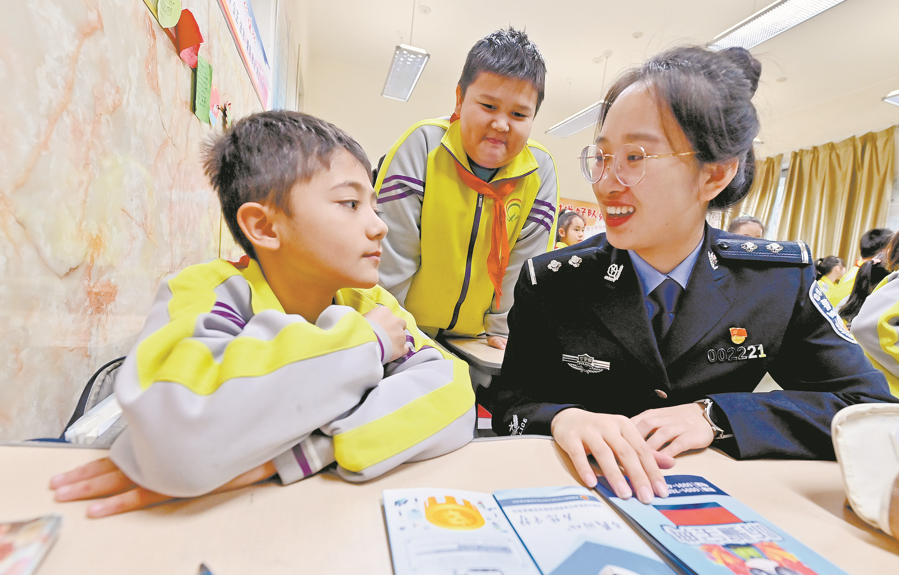 12月16日,乌鲁木齐市公安局沙依巴克区分局碾子沟派出所民警向乌市第42小学学生讲解反诈知识。