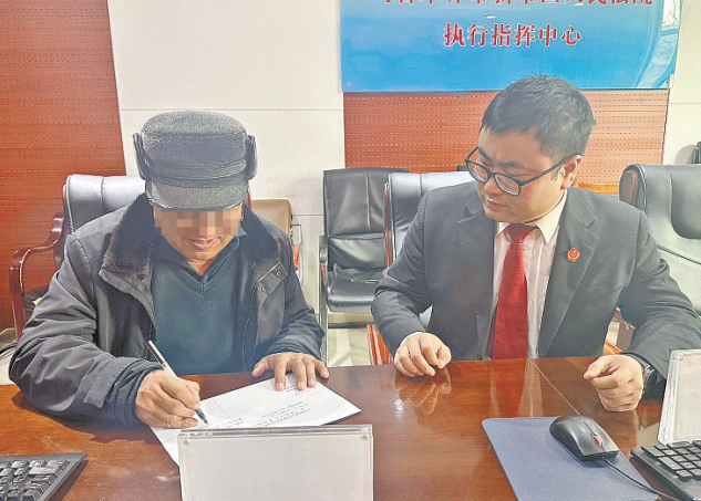 图为申请执行人(左)办理领款手续。 拉扎提·杰恩斯 摄