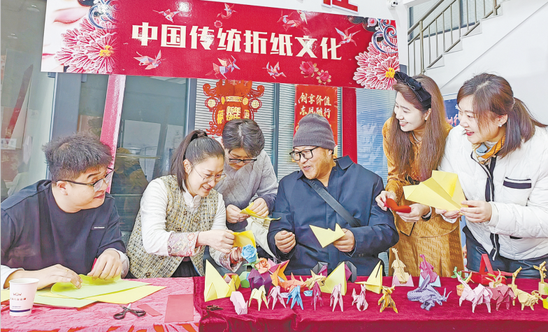当日,乌鲁木齐经济技术开发区(头屯河区)嵩山街街道西湖社区联合北站西路街道丝路社区在天信汽车产业园开展游园、折纸、做非遗手工绒花等活动,喜迎新年。孙振嵩 摄