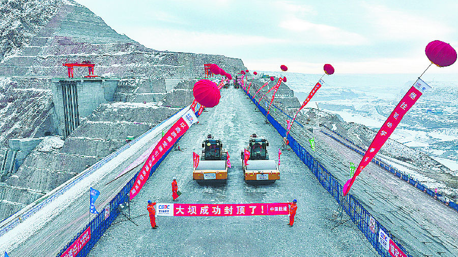 12月30日,世界已建最高混凝土面板砂砾石坝——新疆大石峡水利枢纽工程大坝顺利填筑封顶。 王拓 摄
