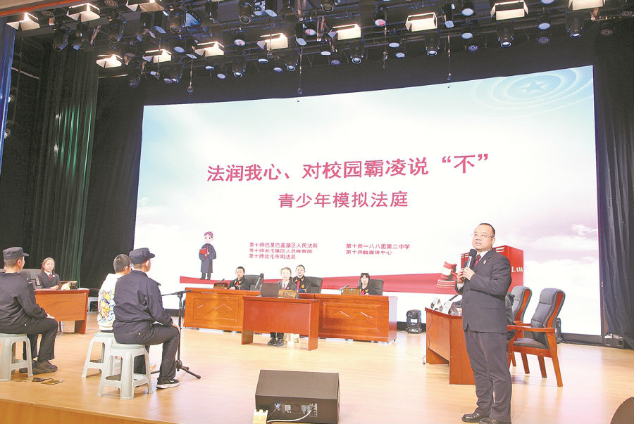 A+ | a近日,兵团第十师北屯垦区人民检察院、巴里巴盖垦区人民法院、兵团第十师北屯市司法局、军垦街道司法行政工作室联合一八八团第二中学开展青少年模拟法庭活动。通过模拟庭审全流程,让广大师生感受司法威严,增强法治意识。图为“庭审”结束后,检察官现场点评活动效果。